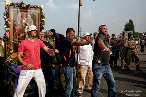 "Участники крестного хода УПЦ МП преодолели блокпост, который устроили противники шествия под Киевом. Противники шествия с флагами ОУН выкрикивали лозунги и бросали в участников Крестного хода яйцами и бутылками. Однако колонну Крестного хода окружил плотный кордон правоохранителей, чтобы не допустить стычек. За пешими участниками Крестного хода двинулись полицейские авто, пожарные машины", - говорится в сообщении "Вестей". Также сайт газеты сообщает, что протестующие остались на блокпосту в окружении правоохранителей.