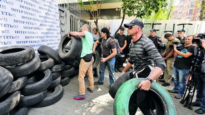 Cкандал вокруг «Интера» продолжает разгораться. Вчера заблокированным оказался главный офис телеканала на улице Дмитриевской. Около двухсот человек организовали тут бессрочный пикет, перекрыв все три выхода из здания, тем самым ограничив сотрудникам доступ на рабочие места. В ночь на понедельник возле главного офиса возвели двухметровый железный забор, опасаясь нападений и поджогов. Но радикалы, вооружившись баллончиками с краской, расписали забор лозунгами и оскорблениями.