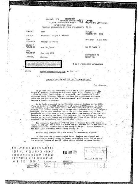 В электронной библиотеке Центрального разведывательного управления США был обнаружен прелюбопытнейший документ на четырех страницах, датированный 1951 годом. В документе утверждается что икона украинского национализма (интегрального национализма, русофобии, антисоветчины и антикоммунизма) Степан Бандера ( Stepan Bandera ) был германским шпионом.
