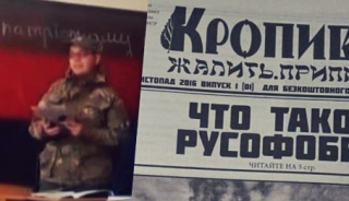 Боевик показывает ученикам некую газету «Кропивач», на первой полосе которой можно увидеть изображение девочки и надпись «Папа, убей русского».