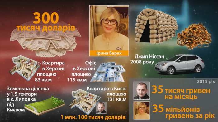 На счетах в банке у Ирины Барах - около 300 тысяч долларов. Есть большая коллекция меха и украшений. А вот автомобиль тоже не новый - джип Ниссан 2008 года. Из недвижимости: квартира в Херсоне площадью 83 кв.м, офис в Херсоне площадью 115 кв.м, земельный участок в 1,5 гектара в с. Липовка под Киевом, квартира в Киеве площадью 131 кв.м, в которой прописан и Матиос. Она приобретена в 2005 году за $1,1 млн.